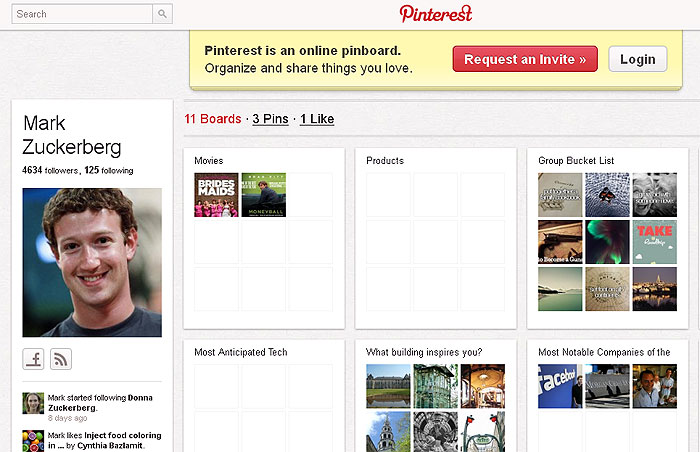 Mark Zuckerberg, CEO e fundador da maior rede social do mundo, o Facebook, criou um perfil em uma rede social concorrente: o Pinterest.