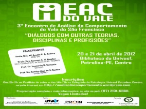 O Colegiado de Psicologia da Univasf realizará nos dias 20 e 21 de abril o 3º Encontro de Análise do Comportamento do Vale do São Francisco (EAC do Vale), no Auditório da Biblioteca da Univasf, no Centro de Petrolina.