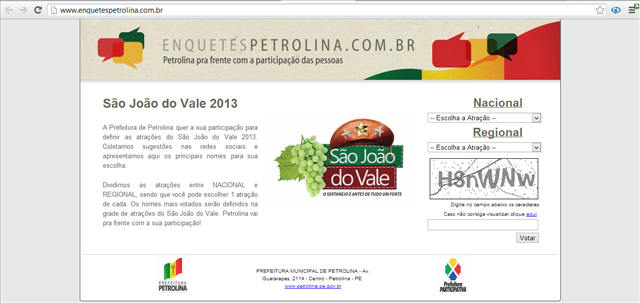 Site Enquete São JoãoA Prefeitura de Petrolina lançou esta semana um site exclusivo para que a população possa escolher as atrações da programação junina deste ano. Até aí tudo bem, mas o que chama a atenção são os artistas que fazem parte dessa numerosa lista.