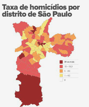 São Paulo teve 1.161 casos de homicídios dolosos na cidade em 2013. Dos 93 distritos policiais, 37 tiveram taxas de homicídio igual ou acima de 10. A maior foi registrada na Sé, região central da cidade: 60,4 homicídios por 100 mil pessoas. Outros dois distritos do Centro aparecem logo atrás, Santa Efigênia, com 30,8, e Brás, com 25,7. Completam a lista dos cinco mais o Campo Limpo (20,4), na Zona Sul, e a Vila Penteado (20,2), na Zona Norte.