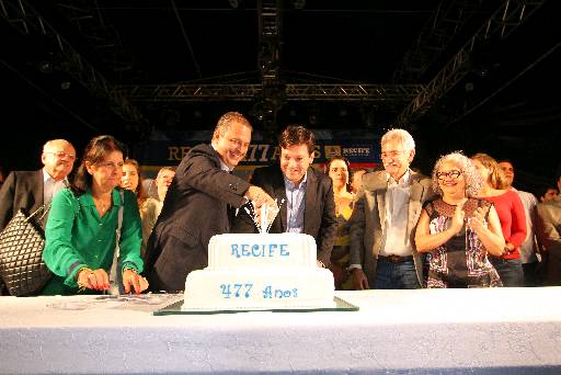 Quatrocentos e setenta e sete anos ao som do frevo, samba e maracatu. Foi assim que o Recife comemorou, na noite desta quarta-feira (12), na Praça do Arsenal, o seu aniversário. Diferentemente das festas anteriores, o bolo neste ano foi simbólico e um pouco mais discreto, com 37 quilos distribuídos em dois andares. Nada de bolo gigante. Mas três mil porções individuais de um bolo chocolate também foram preparadas para serem entregues à população.
