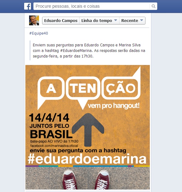 39Após a cerimônia de lançamento de sua candidatura à Presidência da República, na próxima segunda-feira (14), o ex-governador Eduardo Campos (PSB) e a sua vice, a ex-senadora Marina Silva (PSB), participarão de um debate com internautas. Através do site do Partido Socialista Brasileiro, a dupla pretende dar sequência à série de conversa com prováveis apoiadores no mundo virtual da postulação. A convocação está sendo feita nas páginas de Campos e Marina.
