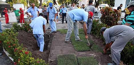 O cemitério de Santo Amaro está recebendo cerca de 500 pessoas a mais por dia desde a última quinta-feira, quando foi anunciado que o corpo do ex-governador Eduardo Campos seria enterrado lá ao lado do túmulo do seu avô, Miguel Arraes de Alencar. Curiosos visitaram o local durante todo o dia. “Pelo movimento, já deu para perceber que o enterro de Eduardo vai bater recorde de gente”, comentou o florista Valter Moura que trabalha há quase três décadas numa das barracas que vendem flores em frente ao cemitério. “Vou passar a noite trabalhando para dar conta das encomendas das coroas”, contou. Ele fará 37 coroas de flores para o enterro do ex-governador e do seu assessor de imprensa, Carlos Percol, também falecido no acidente de avião. Geralmente, o florista produz 70 coroas de flores por semana.