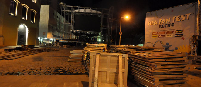 O número de dias e as atrações ainda não foram confirmados, mas a Fifa Fan Fest no Recife corre contra o tempo para armar toda a estrutura que será colocada no Cais da Alfândega, no Recife Antigo. No início da tarde deste domingo (08), o trabalho era intenso, com vários operários trabalhando para deixar tudo pronto para a quinta-feira (12), abertura da Copa do Mundo 2014 e das Fan Fest espalhadas pelo Brasil.