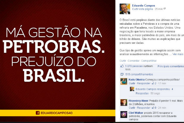 Segundo Eduardo Campos, a Petrobras passa por uma de suas maiores crises por conta de atitudes como essa. “Não é à toa que a Petrobras vive, hoje, a maior crise desde sua fundação. Perdeu metade do seu valor nos últimos três anos. Ela é uma empresa que já foi muito maior do que é hoje e que pode voltar a crescer a partir do momento que passe a ser bem administrada”, escreveu.