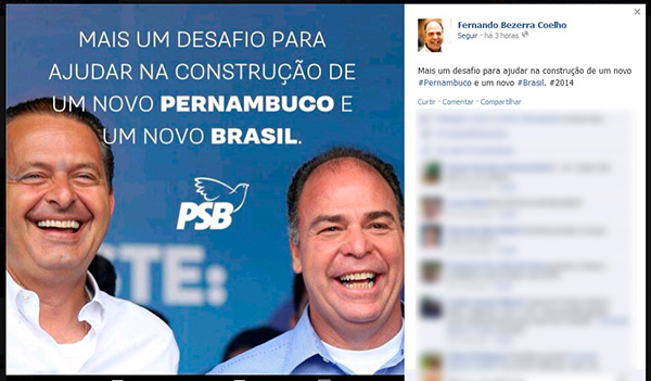 “Mais um desafio para ajudar na construção de um novo Pernambuco e um novo Brasil” foi o comentário em forma de postagem feito pelo ex-ministro da Integração, Fernando Bezerra Coelho em seu perfil no Facebook nesta sexta-feira (21). O nome de FBC deverá ser indicado pelo PSB para disputar a vaga no Senado. O anúncio oficial da chapa, que aconteceria nesta sexta, foi adiado para segunda-feira (24), às 10h. Segundo nota do partido, o adiamento se deu por “incompatibilidade da agenda” do governador Eduardo Campos.