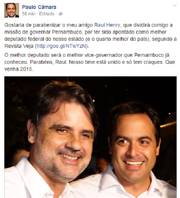 “Gostaria de parabenizar o meu amigo Raul Henry, que dividirá comigo a missão de governar Pernambuco, por ter sido apontado como melhor deputado federal do nosso estado (e o quarto melhor do país), segundo a Revista Veja (http://goo.gl/NTwYzN)”, escreveu, na sua página do Face.