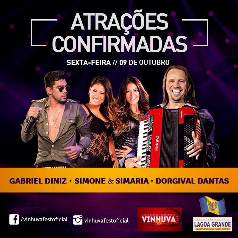 Realizada pela Prefeitura de Lagoa Grande, no Parque Uva e Vinho, no centro do município, os shows da 8ª Vinhuva Fest começam na sexta-feira (9), com as atrações musicais de Dorgival Dantas; Simone e Simaria – As Coleguinhas e Gabriel Diniz. No sábado (10), o público tem um encontro marcado com a alegria e a musicalidade de Luan Estilizado; César Menotti e Fabiano e Coração do Forró. E para encerrar o evento, sobem ao palco no domingo (11), as atrações: Mano Walter, Amado Batista e Novo Amor que prometem agitar a galera.
