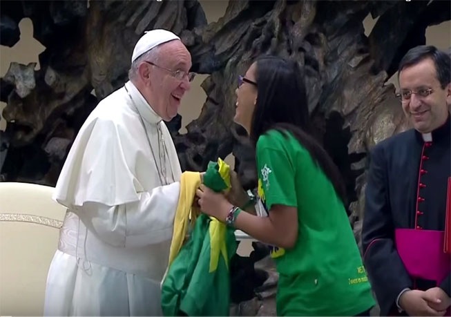 Alguns participantes do encontro são chamados ao microfone para fazer uma pergunta ao papa. Ana Carolina foi uma delas. Ela subiu ao palco e, bastante emocionada, perguntou a Francisco: “qual foi o seu maior desafio em uma missão como sacerdote?”. Antes de responder, o papa, que é argentino, a chama, lhe dá um abraço e pergunta a ela quem foi melhor no futebol, Pelé ou o seu compatriota Diego Maradona. A garota responde, “Pelé”, o que faz o pontífice soltar uma gargalhada.