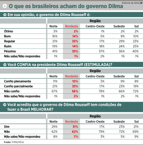 Contrariando o resultado das últimas eleições, os nordestinos revelaram uma opinião sobre o governo Dilma não muito destoante do restante do Brasil. Conforme pesquisa IPMN, 66% dos brasileiros disseram que o governo da petista é ruim e péssimo. Apenas 13% o avaliam com bons olhos, adjetivando-o como ótimo e bom. O Sudeste, o Sul e o Centro Oeste aparecem como as regiões que mais são pessimistas em relação à presidente Dilma – 60%, 65% e 75%, respectivamente, disseram que o governo é ruim e péssimo.