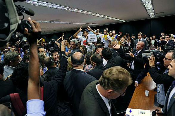 A confusão começou quando o deputado Vitor Valim (PMDB-CE) reclamou das vaias dos manifestantes, que ocuparam os lugares dos deputados.