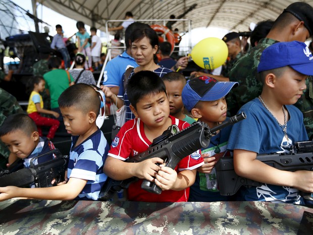 Um fotógrafo da agência Reuters registrou neste sábado (9) crianças manuseando armas em uma unidade militar em Bagcoc, na Tailândia.