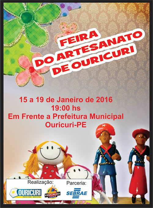 Desta sexta-feira (15) até o dia 19 de janeiro acontecerá mais uma edição da “Feira do Artesanato de Ouricuri”. A feira será realizada durante as novenas do padroeiro São Sebastião e será montada em frente à prefeitura, a partir das 19h.
