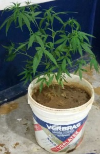 Após a abordagem, foi encontrada com o mais velho uma munição de revólver calibre 38. Marcos Michel disse aos policiais ter encontrado a munição, mas a resposta não convenceu a equipe do 5°BPM, que foi até a residência do rapaz. A tia dele, que estava em casa naquele momento, alegou que os dois jovens são primos e usavam a casa para dormir e “guardar objetos”. No local a polícia encontrou quatro aparelhos celulares e cinco baterias de vários celulares – tudo sem nota fiscal –, além da erva cultivada num balde plástico. Os envolvidos e o material apreendido foram entregues à delegacia de plantão. (foto: 5°BPM/divulgação)