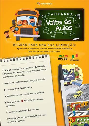 Para a campanha Volta às Aulas, foram criados materiais gráficos (folders) que destacam a importância do uso do cinto de segurança, transporte de crianças menores de 7 anos, não forçar passagens, além de outras orientações para motoristas, pedestres e motociclistas.